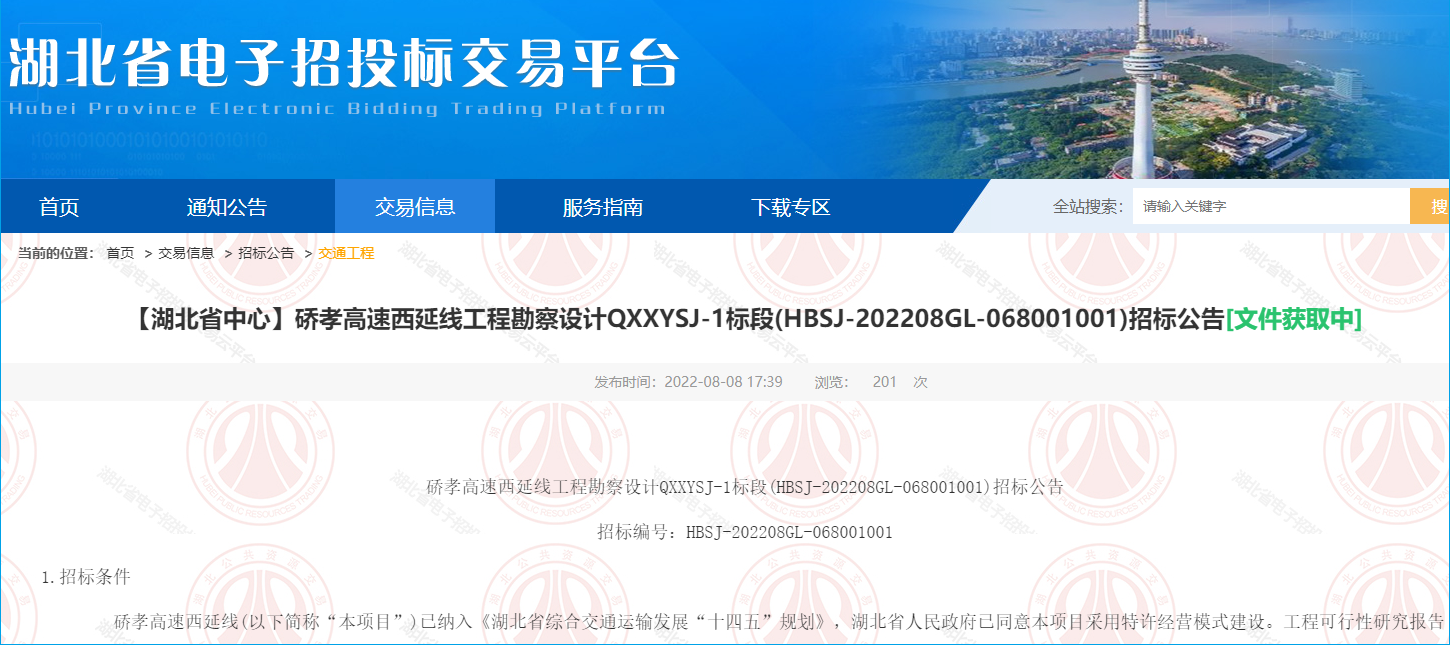 2022年8月8日,湖北省电子招投标交易平台发布了硚孝高速西延线工程勘察设计QXXYSJ-1标段招标公告,已纳入湖北省综合交通运输发展十四五规划,本项目招标人为孝感市交通运输局,项目总投资估算约132亿元。