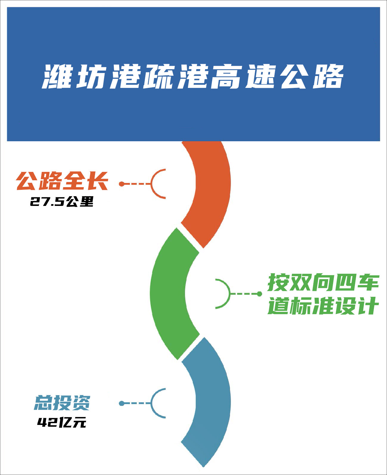 潍坊港疏港高速公路是山东省高速公路网规划中的重要连接线项目,北接潍坊港中港区黄海路,南接G1815潍日高速,线路全长27.5公里,按双向四车道标准设计,估算总投资42亿元。据介绍,该项目预计2022年内开工,计划建设工期3年。关键词:交通项目建设、基建工程、国内工程