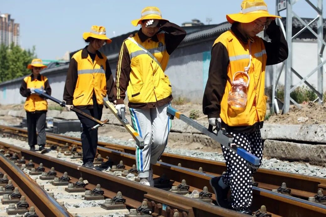 三伏天里,钢轨最高气温超过70°C,别说来回弯腰、探身,即使在线路旁的热浪里站一会儿都一身汗,但是“黄玫瑰”们无所畏惧。