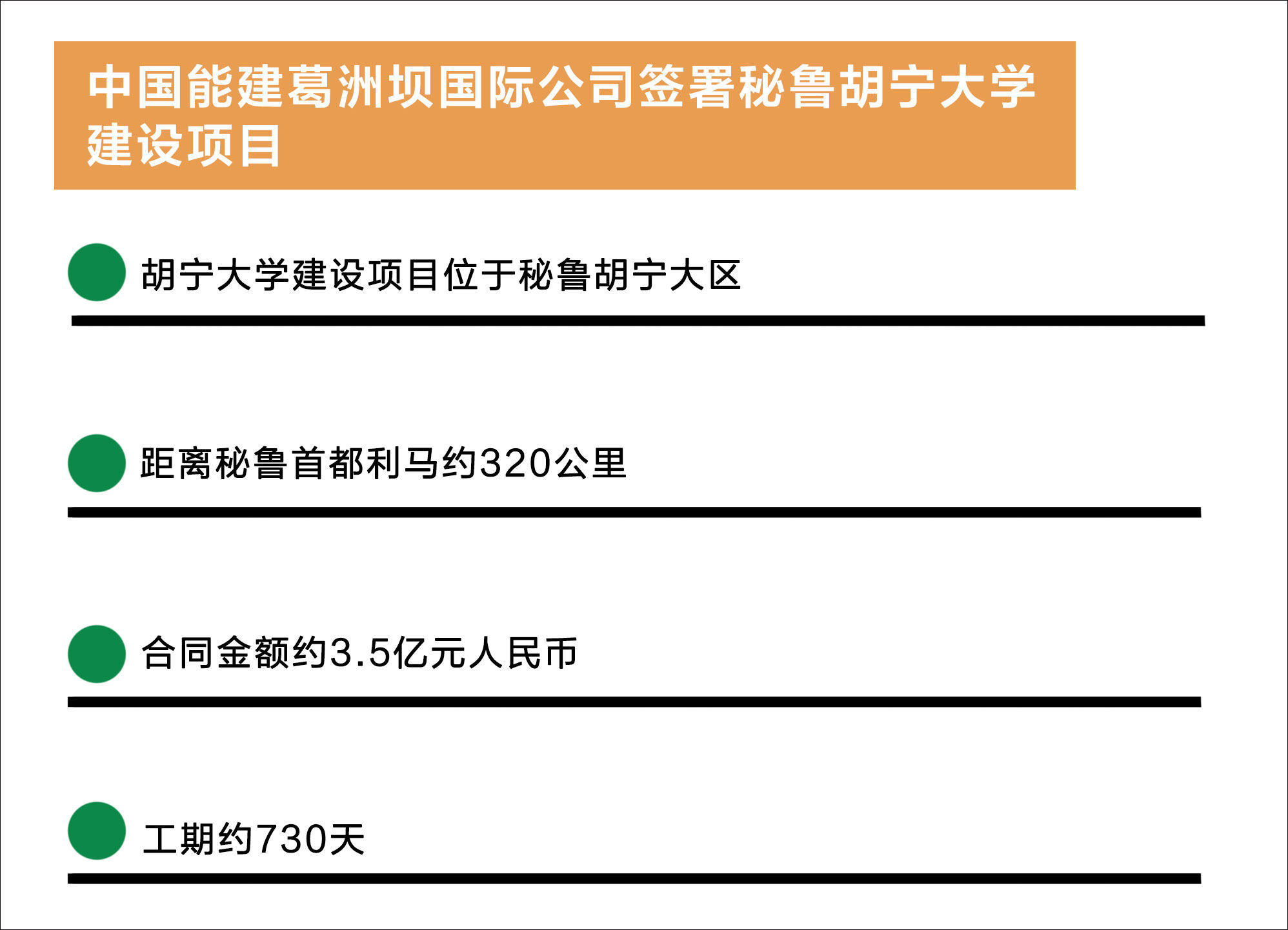 据悉,胡宁大学建设项目位于秘鲁胡宁大区,距离秘鲁首都利马约320公里。项目工程内容包括5867.19平方米的土木工程专业学校、3892.63平方米的环境工程专业学校、2876.88平方米的跨文化教育专业学校、2033.97平方米的国际贸易管理专业学校、4168.55平方米的校区环境改善、4168.55平方米的大学休闲娱乐区域以及287.49平方米的配套设施等,合同金额约3.5亿元人民币,工期约730天。关键词:一带一路工程、一带一路项目建设、海外工程建设