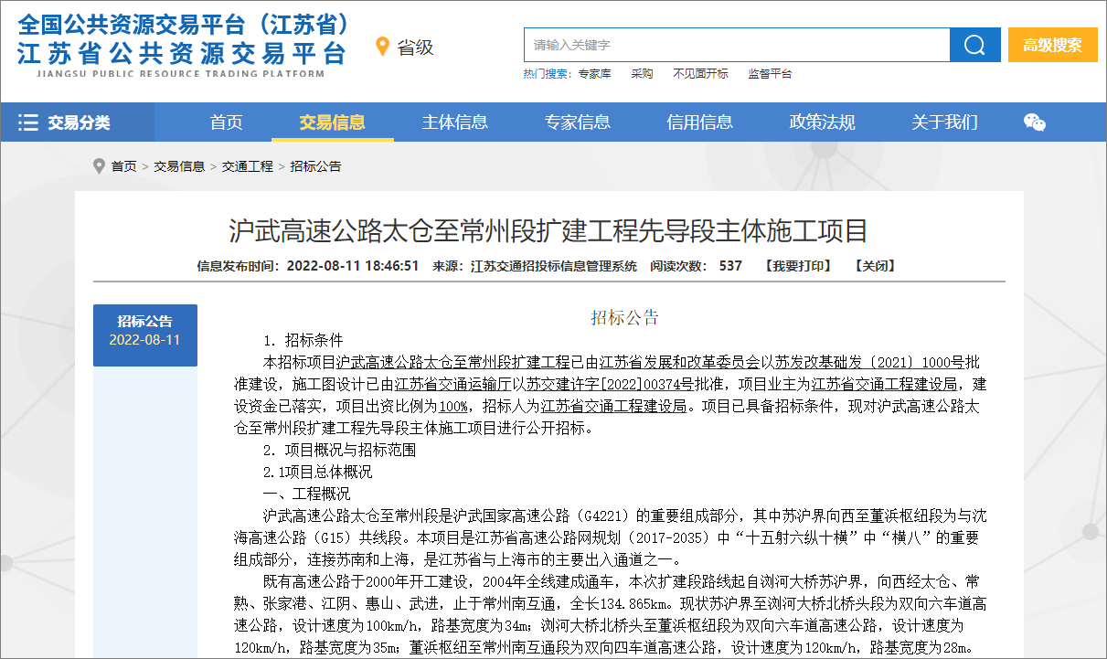 2022年8月11日,江苏省公共资源交易平台发布沪武高速公路太仓至常州段扩建工程先导段主体施工项目招标公告,该项目已由江苏省发展和改革委员会批准建设,招标人为江苏省交通工程建设局,工程概算投资360.5亿元。