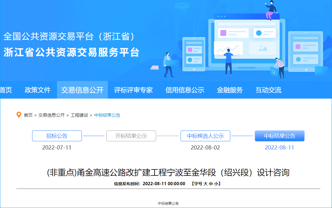 2022年8月11日,浙江省公共资源交易服务平台发布甬金高速公路改扩建工程宁波至金华段绍兴段设计咨询招标公告,中标人中交公路规划设计院有限公司,中标价1032.49万元。