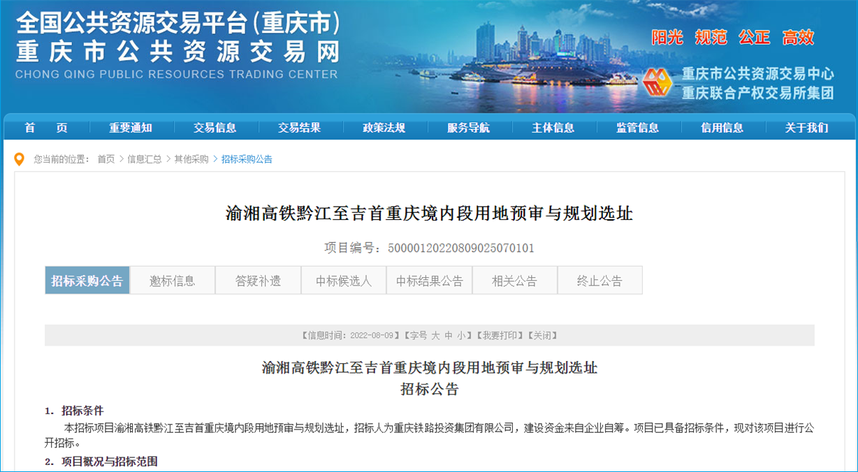 2022年8月9日,重庆铁路投资集团有限公司发布了渝湘高铁黔江至吉首重庆境内段用地预审与规划选址招标公告,项目已纳入十四五铁路发展规划,目前重庆段已进入可研批复前置要件的编制和审批阶段,有望在十四五期间开工建设。