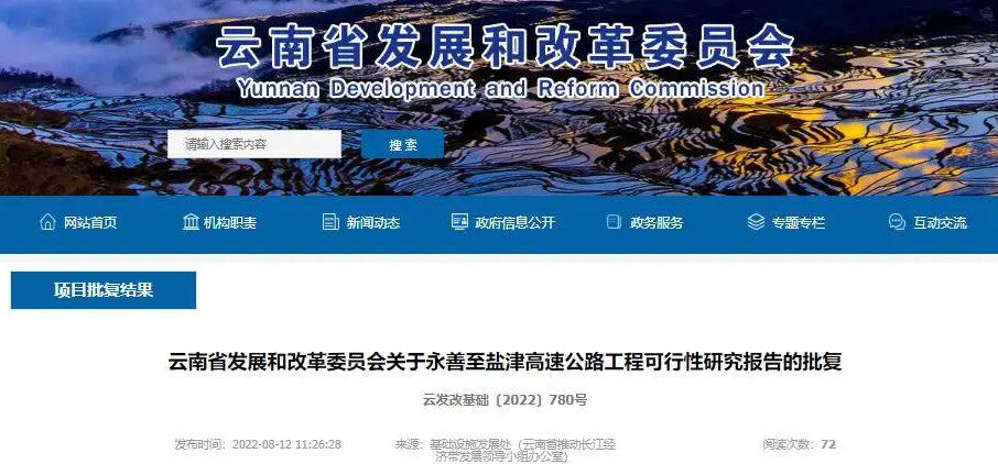 2022年8月12日,云南省发改委网站发布关于永善至盐津高速公路工程可行性研究报告的批复。