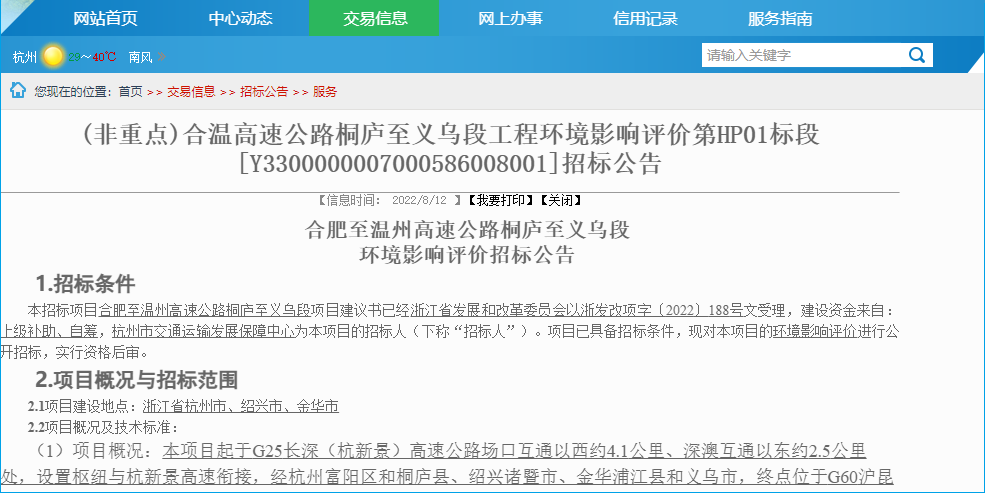 2022年8月12日,浙江省交通运输厅发布合肥至温州高速公路桐庐至义乌段环境影响评价招标公告,该项目招标人为杭州市交通运输发展保障中心,本项目总投资约257.2亿元,其中建安费约159.6亿元。