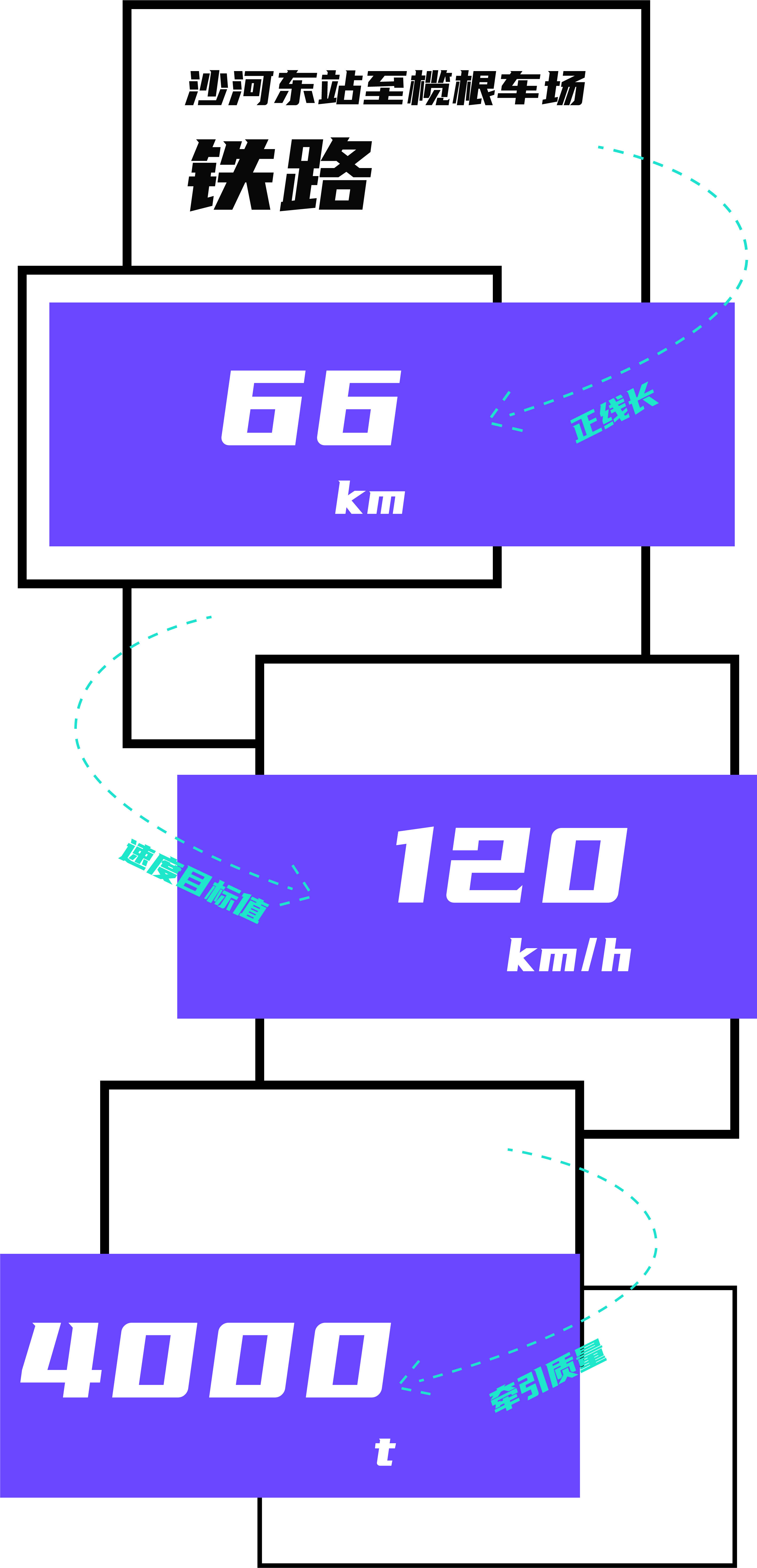 沙河东站至榄根车场铁路等级:Ⅱ级;正线数目:单线;速度目标值:120km/h;最小曲线半径:一般地段为1200m,困难地段800m;限制坡度:6‰;牵引种类:电力;机车类型:货机暂定交流传动机车;牵引质量:4000t;到发线有效长度:850m;闭塞类型:半自动闭塞。