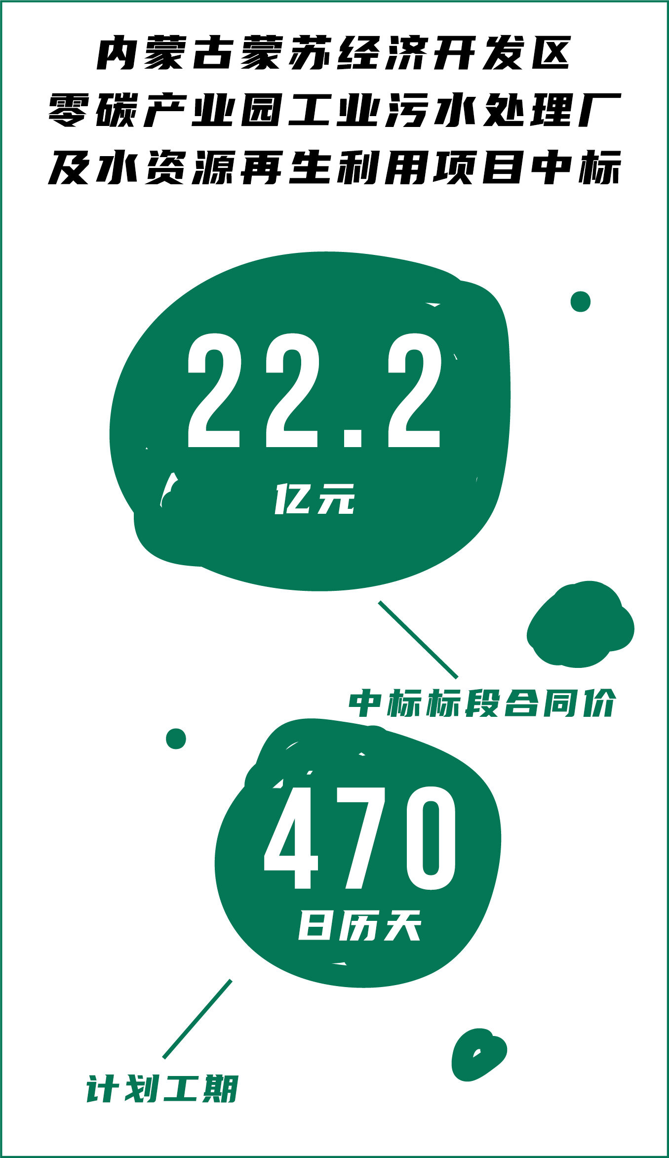 2022年8月12日,内蒙古自治区公共资源交易网发布蒙苏经济开发区零碳产业园工业污水处理厂及水资源再生利用项目设计、采购、施工标段总标候选人公示,该项目由中铁上海工程局集团有限公司联合体中标,标段合同价22.2亿元。