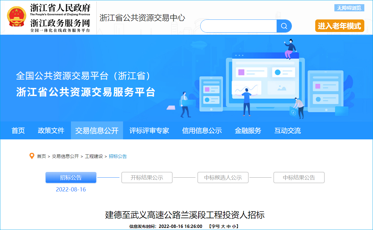 2022年8月16日,浙江省东东资源交易平台发布建德至武义高速公路兰溪段工程投资人招标公告,项目采用经营性公路投资方式建设。兰溪市交通运输局为本项目的实施机构及招标人,全线估算总造价87.8亿元,其中建安费46.3 亿元。