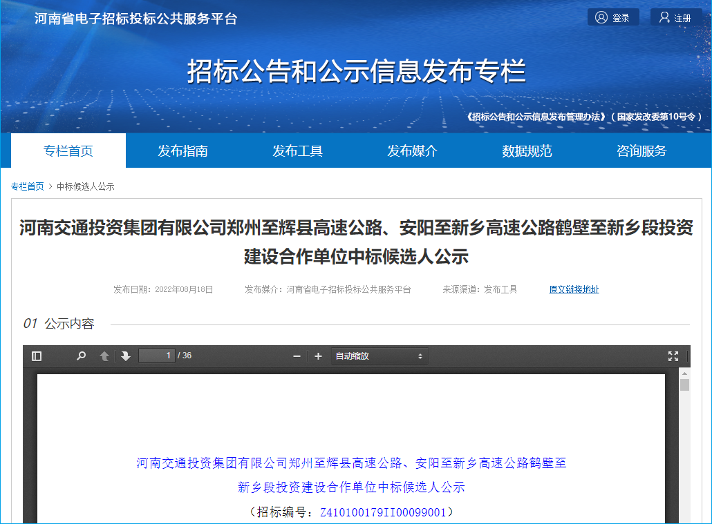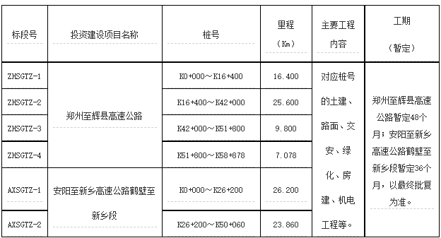2022年8月18日,河南省公共资源交易中心发布了河南交通投资集团有限公司郑州至辉县高速公路、安阳至新乡高速公路鹤壁至新乡段投资建设合作单位中标候选人公示,该项目施工共划分为6个标段,项目总投资约146亿元。