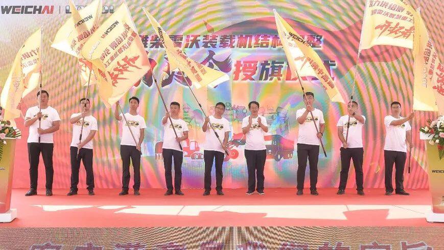 “我将不辱使命,躬身前行,以点带面,鼓舞士气,拿下中高端市场!”一面面旗帜迎风舞动,一句句誓言铿锵有力。本次大会还举行了装载机结构调整动员授旗仪式。旗帜的授予意味着全新的开篇,是荣誉、是责任、更是使命。