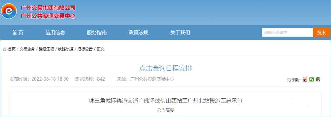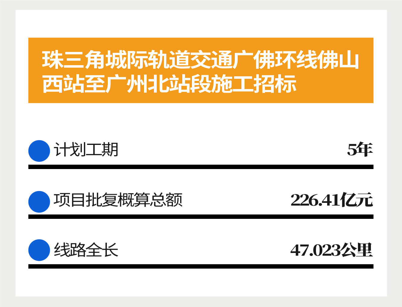 2022年8月16日,珠三角城际轨道交通广佛环线佛山西站至广州北站段施工总承包招标公告发布,项目即将进入正式施工阶段,计划工期5年。