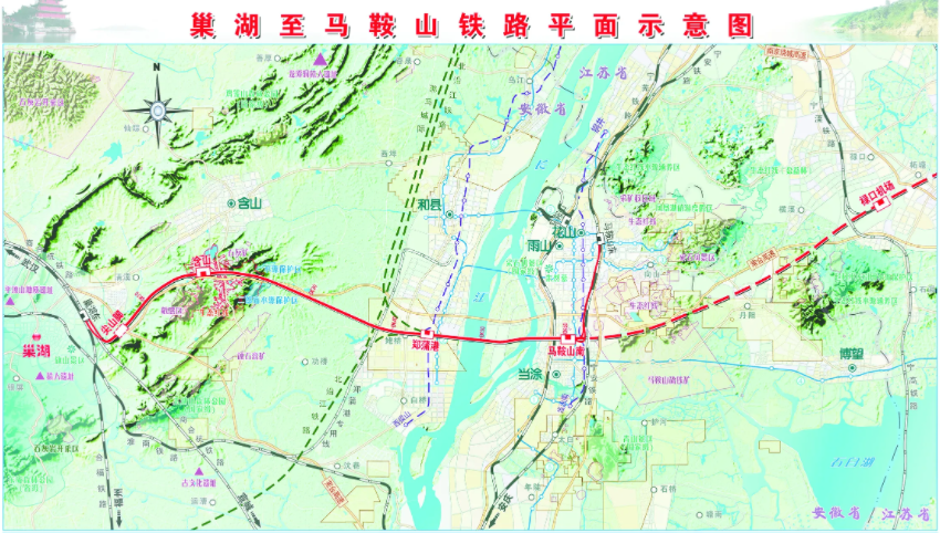 新建巢湖至马鞍山城际铁路位于安徽省中东部,新建线路西起合肥市所辖巢湖市,南至马鞍山市花山区,中途还经过马鞍山市所辖含山县、和县、郑蒲新区、当涂县、经开区、雨山区,沿线经过安徽省2市8县区。