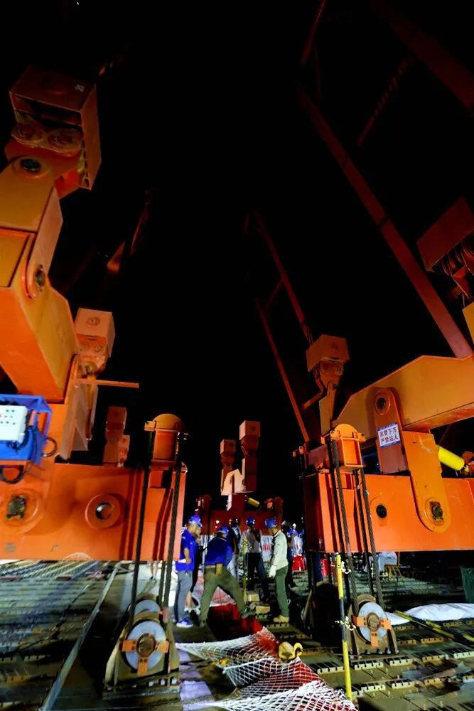 本次安装的中央无轴力连接装置为全桥跨中合龙段,由南、北两节“大箱梁”内套四根“芯梁”组成,单侧箱梁长6.7米、宽31.6米、高3.8米,连同内部导梁重达440吨。