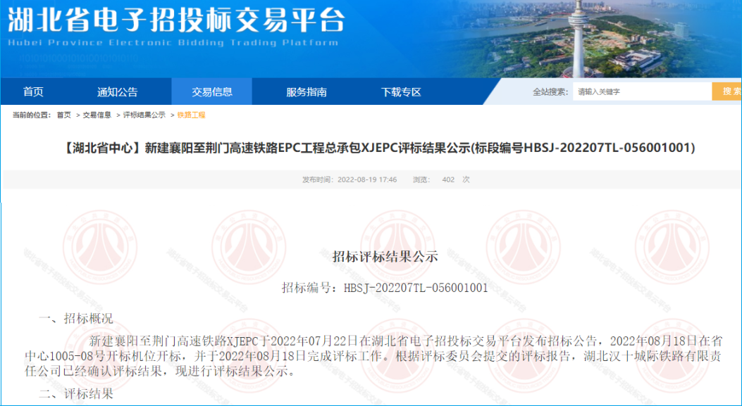 2022年8月19日,湖北省电子招标交易平台发布新建襄阳至荆门高速铁路EPC工程总承包XJEP评标结果公示,该项目计划工期42个月,项目批复总投资188.32亿元。
