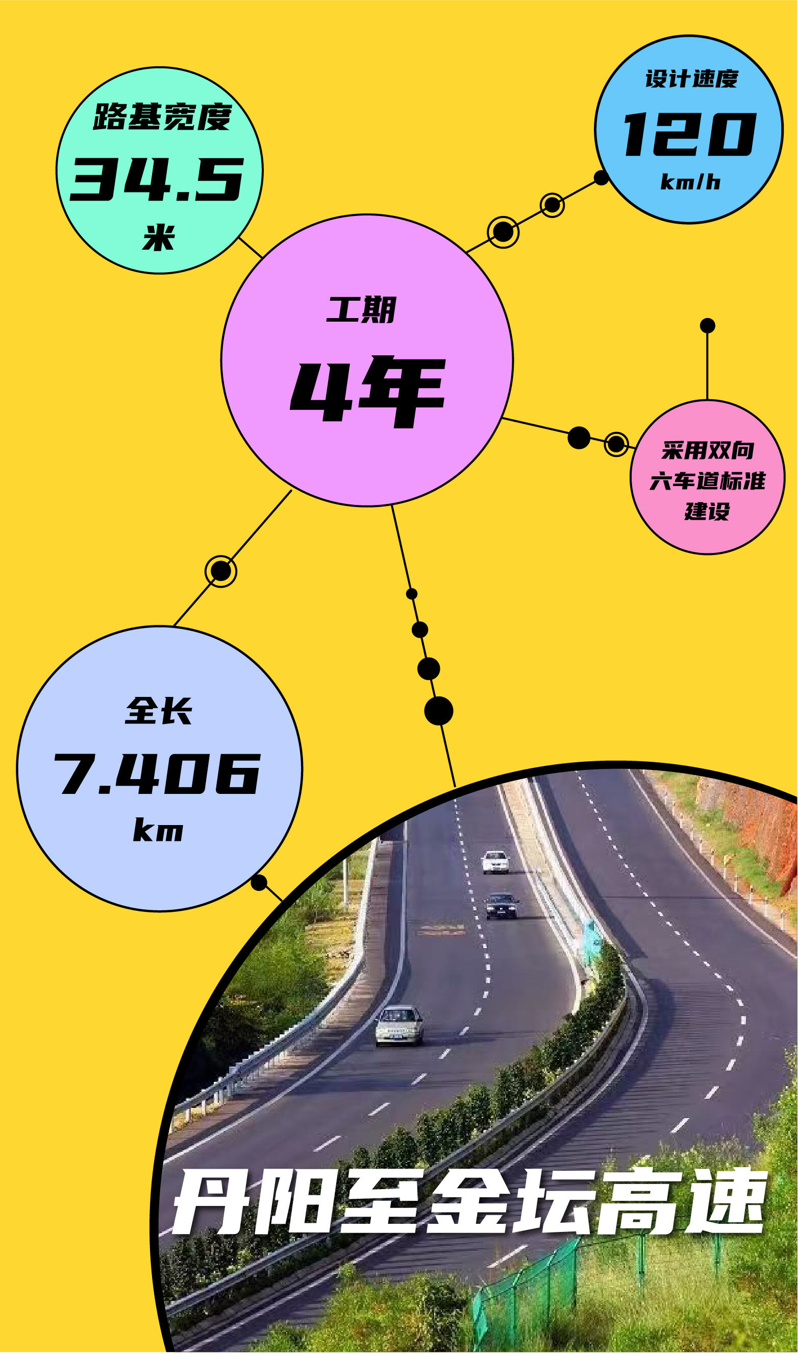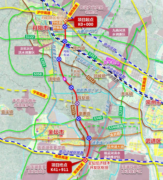 其中,丹阳至金坛高速公路丹阳段路线全长28.627公里,批复概算为96.01亿。全线按照双向六车道技术标准进行建设,设计速度120公里/小时,路基宽度34.5m。建设工期4年。