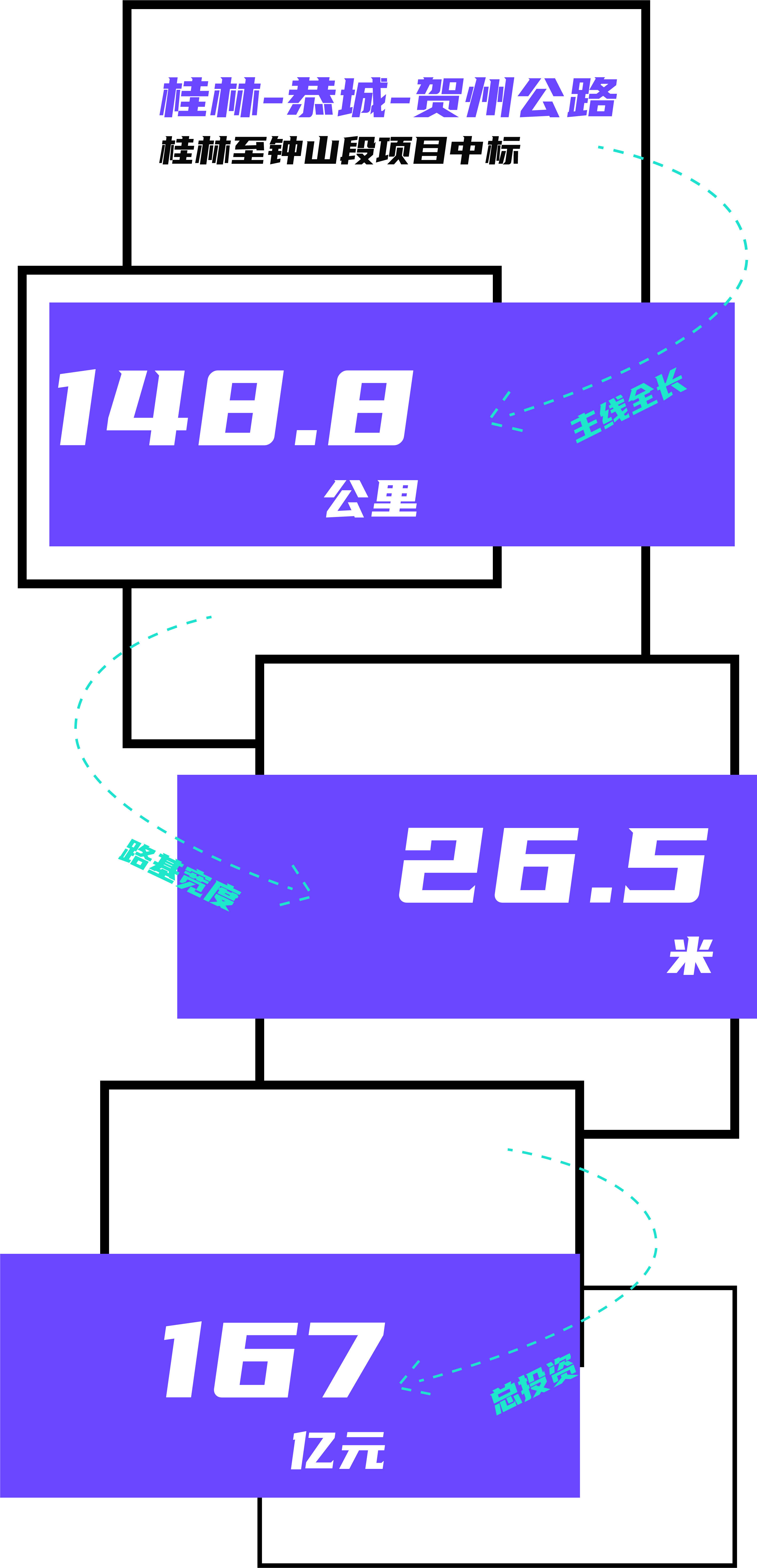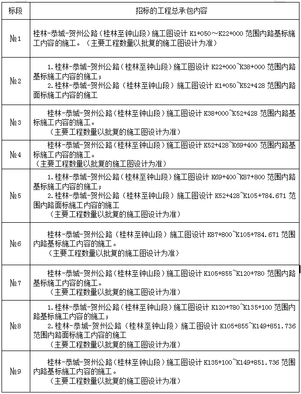 №1标段由中交第二公路工程局有限公司、上海远通路桥工程有限公司、中交二公局第七工程有限公司、广西桂秦公路工程有限公司中标,工程总承包报价13.85亿元;№2标段由中交第四公路工程局有限公司、广西桂秦公路工程有限公司中标,工程总承包报价15.63亿元;№3标段由广西路桥工程集团有限公司、广西桂秦公路工程有限公司中标,工程总承包报价18.24亿元;№4标段由江西省交通工程集团有限公司、江西省交通工程集团建设有限公司、广西桂秦公路工程有限公司中标,工程总承包报价20.97亿元;№5标段由中铁一局集团有限公司、广西桂秦公路工程有限公司中标,工程总承包报价23.41亿元;№6标段由华邦建投集团股份有限公司、广西桂秦公路工程有限公司中标,工程总承包报价19.57亿元;№7标段由中交第二航务工程局有限公司、中交二航局第四工程有限公司、广西桂秦公路工程有限公司