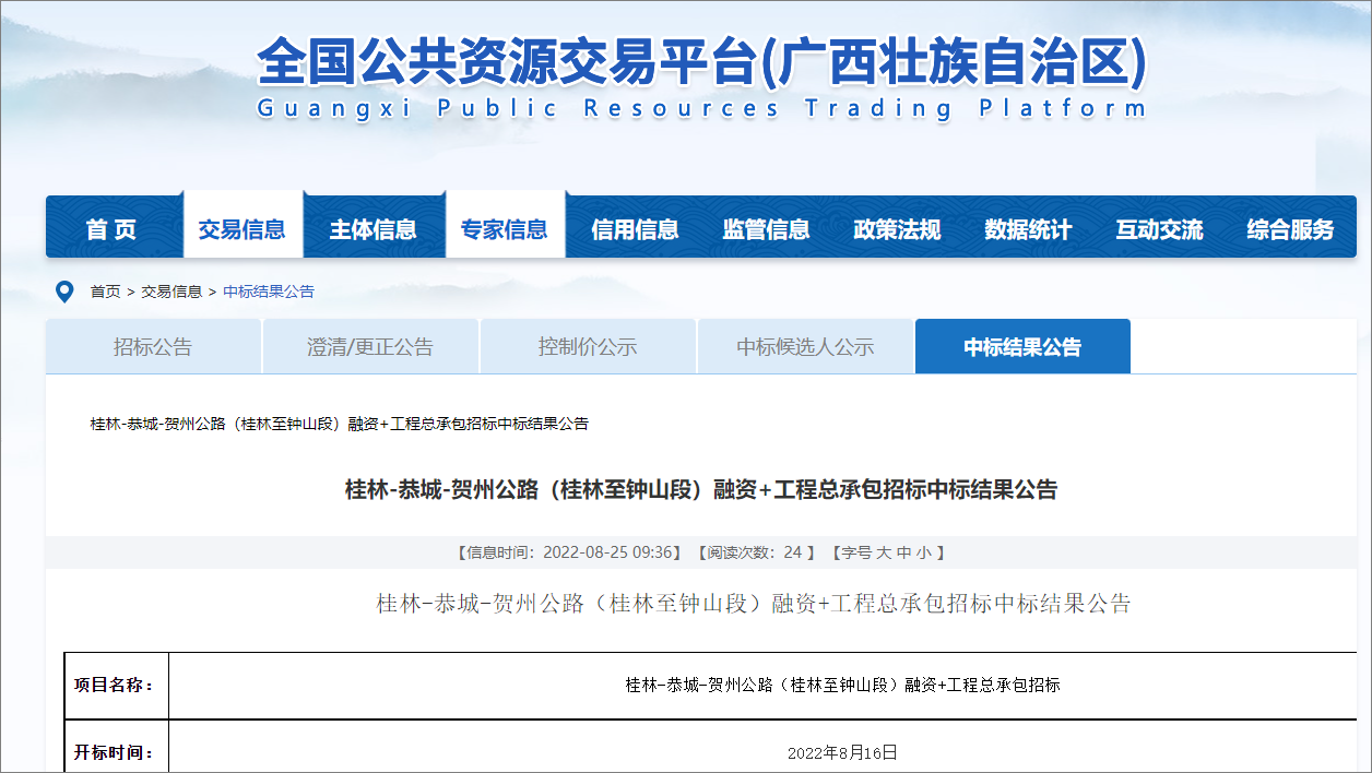 2022年8月25日,从广西壮族自治区公共资源交易中心中心了解到,桂林-恭城-贺州公路桂林至钟山段融资+工程总承包中标候选人已出炉,该项目共划为9个标段,由中交第二公路工程局有限公司等23家公司中标,项目概算总投资约167亿元。