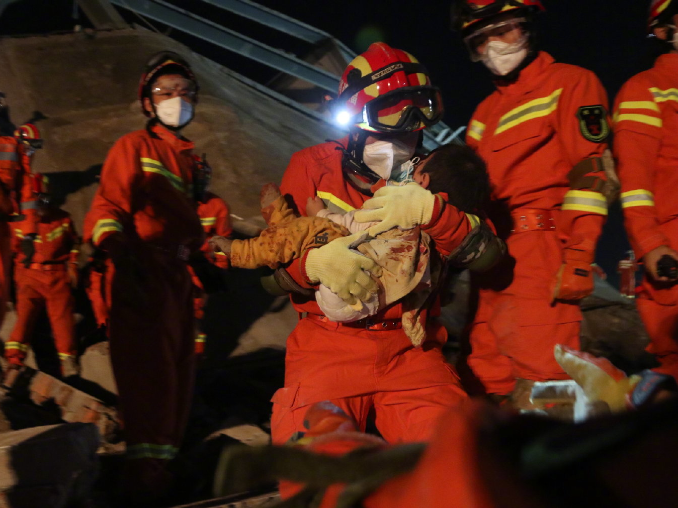 女子被救出后,她的儿子还被困在废墟中,被楼板压住,而在另一侧,厦门市消防救援支队也在对被困小男孩进行施救。为尽快将男孩救出,漳州市消防救援支队救援人员则利用液压顶杆将压住男孩的楼板顶起,14时许男孩终于被安全救出。