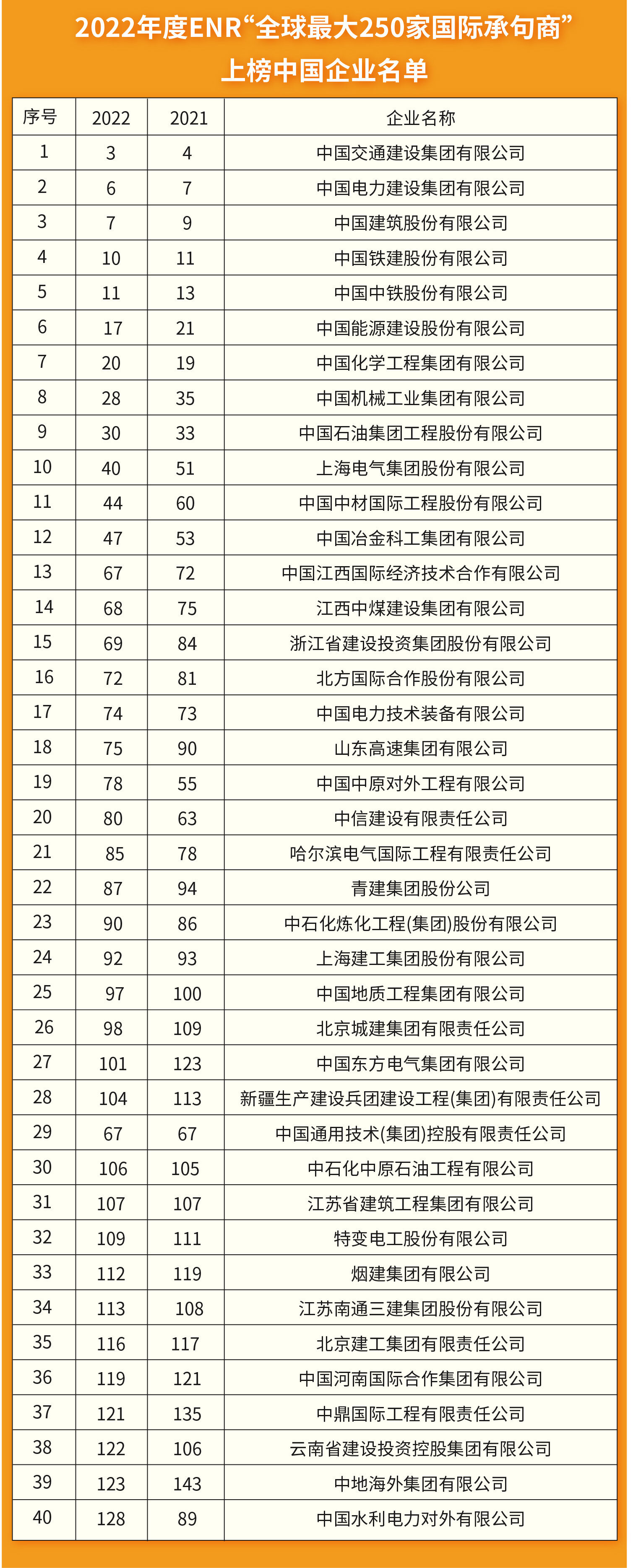 近期,2022年度美国《工程新闻纪录(ENR)》全球最大250家国际承包商榜单发布。由中国对外承包工程商会组织申报的中国企业中,共有79家企业入围。