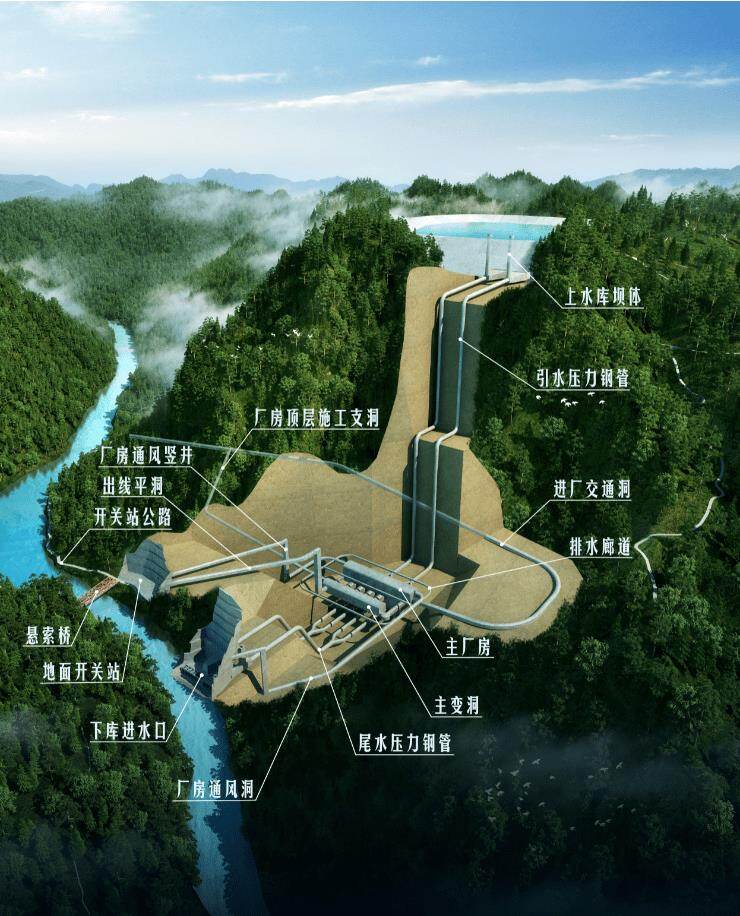 贵州省水城野龙拢抽水蓄能电站位于贵州省六盘水市水城区蟠龙镇境内,距贵阳市直线距离约162km,距离六盘水市直线距离约36km。枢纽工程由上水库、下水库、输水系统、地面厂房及开关站等组成,电站距高比7.0。上水库位于蟠龙镇高仲村春菜冲冲沟内,集水 面积1.10km2,初拟挡水建筑物为沥青混凝土面板堆石坝,采用全库盆沥青混凝土面板防渗,最大坝高111m。下水库位于蟠龙镇营发村境内的巴郎河左岸弯家沟内,集水面积7.11km2,初拟挡水建筑物为混凝土面板堆石坝,最大坝高142m。电站初选装机容量1200MW,初拟额定水头578m;建成后供电贵州电网,主要承担调峰、填谷、储能、调频、调相、紧急事故备用等任务,有效促进区域新能源开发利用。