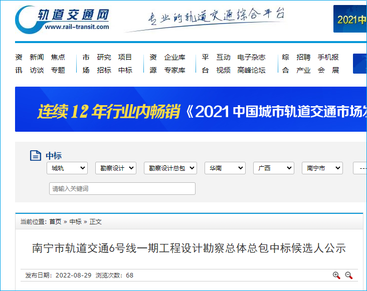 2022年8月29日,轨道交通网发布了南宁市轨道交通6号线一期工程设计勘察总承包中标候选人公示,该项目建设地点位于 广西壮族自治区南宁市,项目总投资158.40亿元。