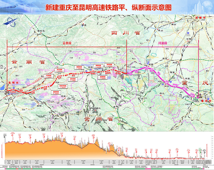 新建重庆至昆明高速铁路重庆西至嵩明段设计里程为DK2+464~DK675+509.9,正线长度645.109公里。