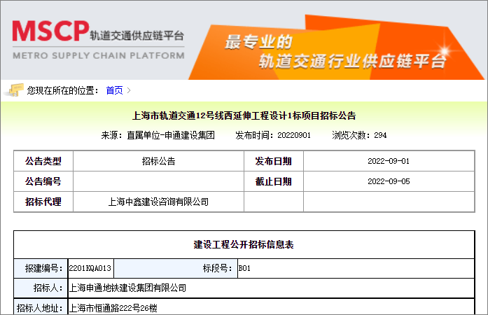 2022年9月1日,上海市地铁采购平台发布了上海市轨道交通12号线西延伸工程项目招标公告,该项目所属行业轨道交通,招标人上海申通地铁建设集团有限公司,项目总投资176.3亿元。