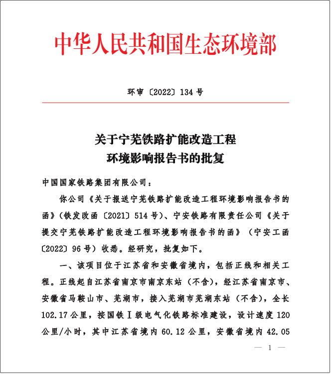 近日,宁芜铁路扩能改造工程环境影响评价报告获生态环境部批复,标志着项目向全线开工建设迈出了坚实的一步。