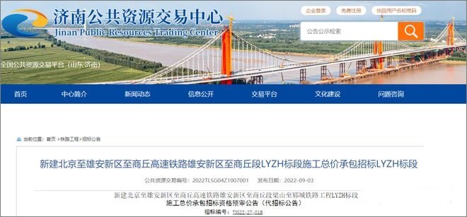 2022年9月3日,新建北京至雄安新区至商丘高速铁路雄安新区至商丘段梁山至郓城铁路工程LYZH标段施工总价承包招标资格预审公告及施工监理招标LYJL标段招标公告在济南公共资源交易中心发布。该项目已由国家发展改革委批准建设,项目业主为雄安高速铁路有限公司。其中梁山至郓城段由雄安高速铁路有限公司委托中国铁路济南局集团有限公司代建,招标人为中国铁路济南局集团有限公司鲁南高铁工程建设指挥部。