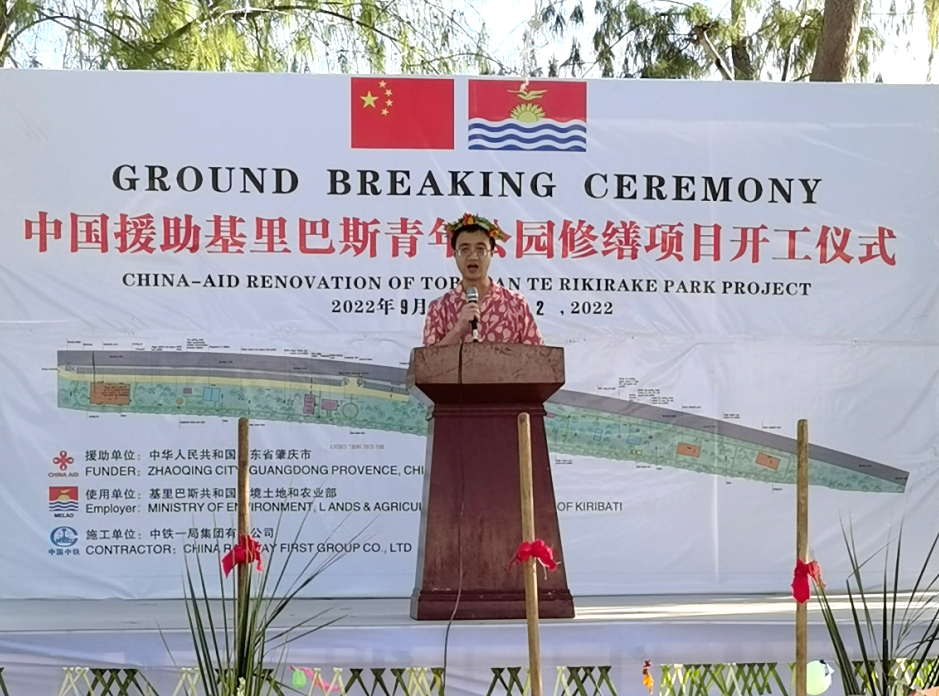 2022年9月2日,基里巴斯当地时间下午16:00,中铁一局基里巴斯青年公园修缮项目开工仪式隆重举行。基里巴斯农业部特凯亚拉部长、中国驻基里巴斯大使馆临时代办赵健等出席开工仪式;广东省外事办主任柳琛子、肇庆市市长许晓雄、中铁一局海外事业部总经理孙高峰以视频方式向远在南太平洋的开工盛典送来祝贺。