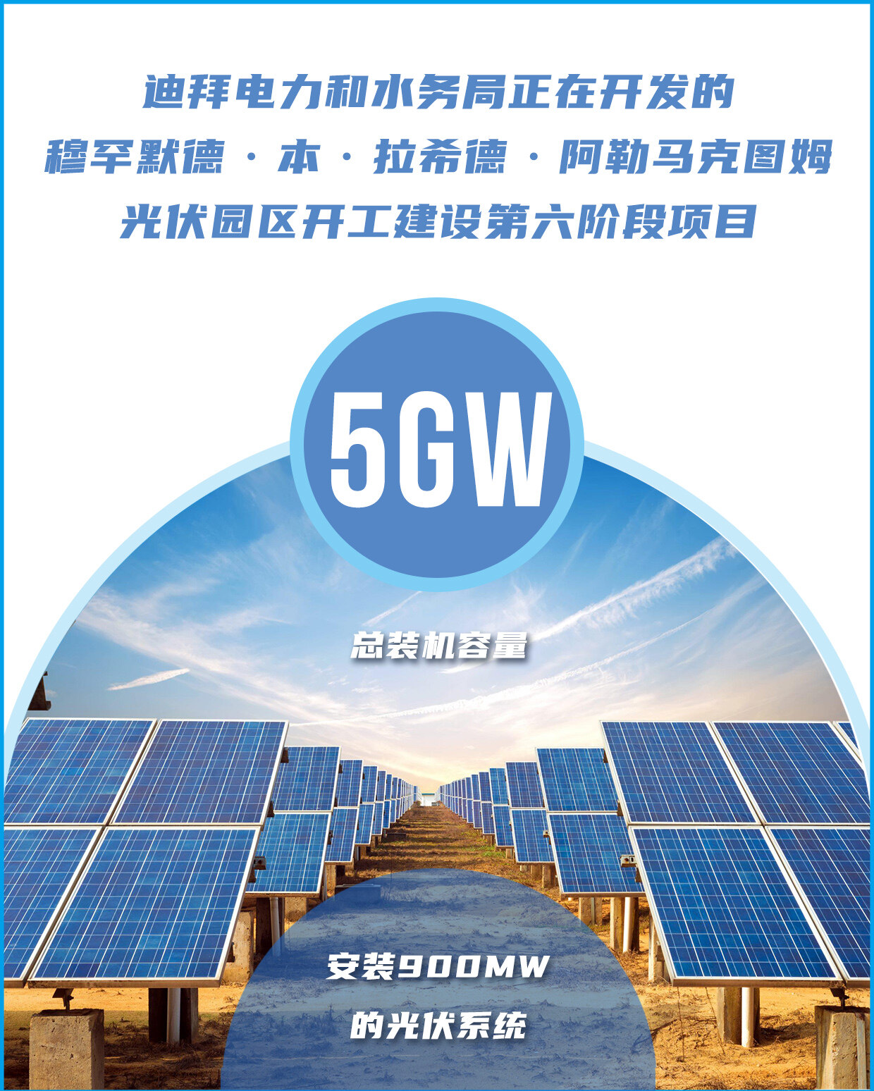 迪拜电力和水务局正在开发的穆罕默德·本·拉希德·阿勒马克图姆光伏园区开工建设第六阶段项目。而迪拜电力和水务局表示正在开发世界上规模最大的单一光伏园区,这个总装机容量为5GW的光伏园区第六阶段将安装900MW的光伏系统。