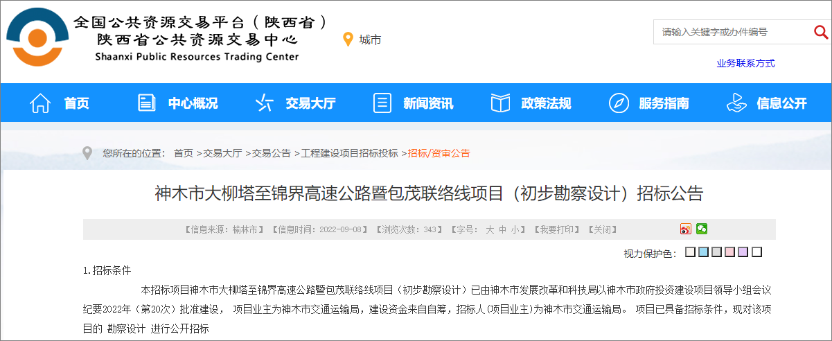 On September 8, 2022, the Shaanxi Provincial Public Resources Trading Center released the preliminary survey and design bidding announcement for the Shenmu City Daliuta-Jinjie Expressway and Baomao Contact Line Project. The project tenderer is the Shenmu City Transportation Bureau, with a total project investment of 7.686 billion Yuan.