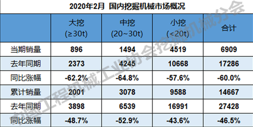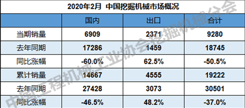 根据中国工程机械工业协会行业统计数据,2020年1—2月纳入统计的24家主机制造企业,共计销售各类挖掘机械产品19222台,同比涨幅-37.0%。国内市场销量14667台,同比涨幅-46.5%。出口销量4555台,同比涨幅48.2%。