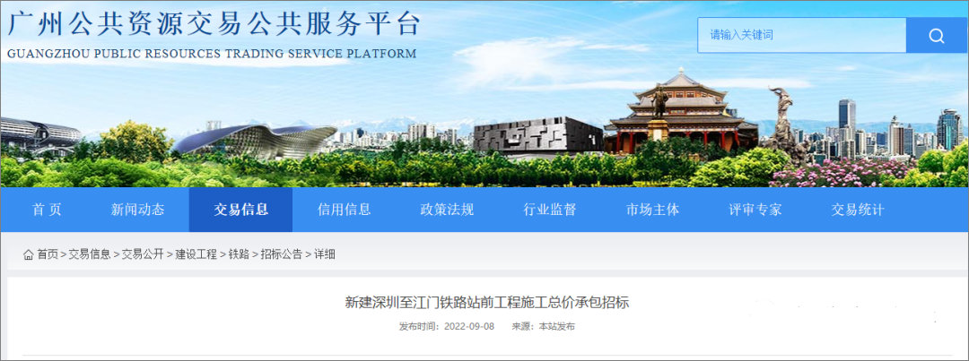 2022年9月8日,新建深圳至江门铁路站前工程施工总价承包招标及施工监理招标公告发布。项目计划9月底正式开工建设,建设总工期5.5年。