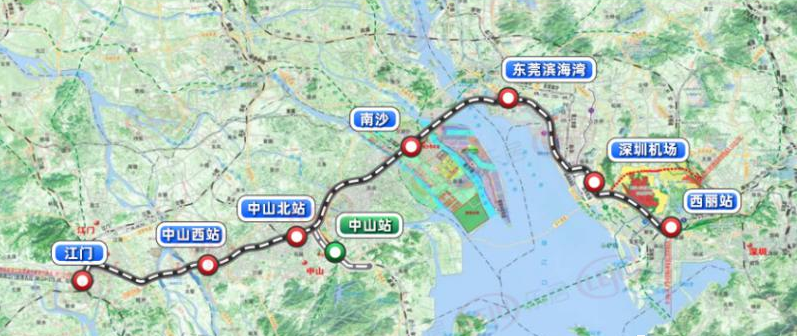 全线共设西丽、深圳机场东、东莞滨海湾、南沙、中山北、横栏、江门共7座车站,其中西丽、深圳机场东为地下站,东莞滨海湾、南沙、中山北、横栏为高架站,江门站为地面站,西丽站纳入西丽至光明城项目建设。另结合广珠城际中山站至深江铁路深圳方向联络线引入,对既有中山站进行改扩建。