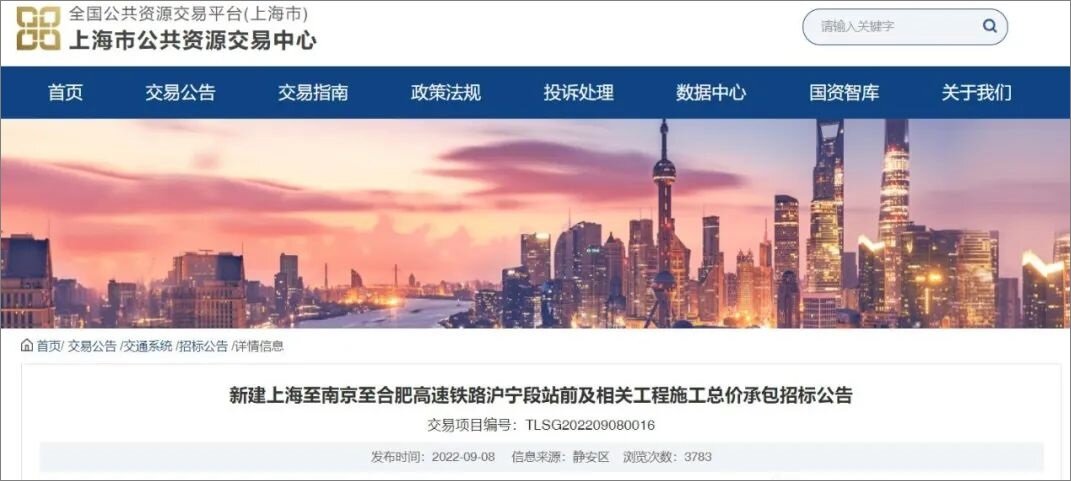 2022年9月8日,新建上海至南京至合肥高速铁路沪宁段站前及相关工程施工总价承包招标公告及监理招标公告在上海市公共资源交易中心发布。沪渝蓉沿江高速铁路上海及江苏段将于10月正式开工建设。至此,北沿江高铁上海至南京至合肥段全线即将正式开工。