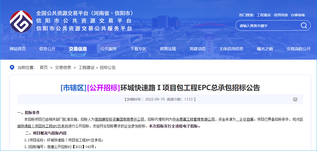 On September 10, 2022, the Xinyang Public Resource Trading Platform released the EPC general contract bidding announcement for the Huancheng Expressway I project in Xinyang City, Henan Province. The project construction site is located in Xinyang City, with a planned total investment of about 8.857 billion yuan.
