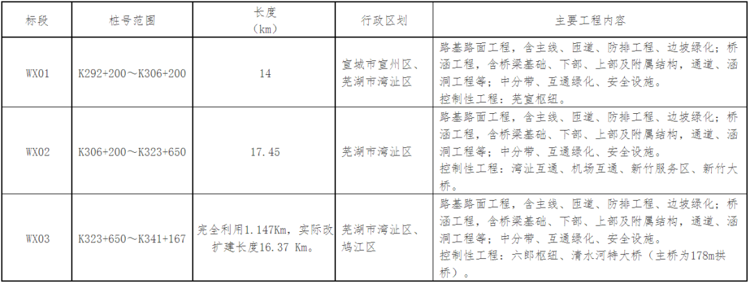 本次招标范围为G50沪渝高速、G5011芜合高速宣城至芜湖段改扩建土建工程(含路基、路面、桥涵、安全设施、中分带、边坡及互通绿化等),包含施工、交验、缺陷期修复等工作内容。本次招标划分为3个施工标段,标段划分如下: