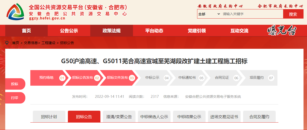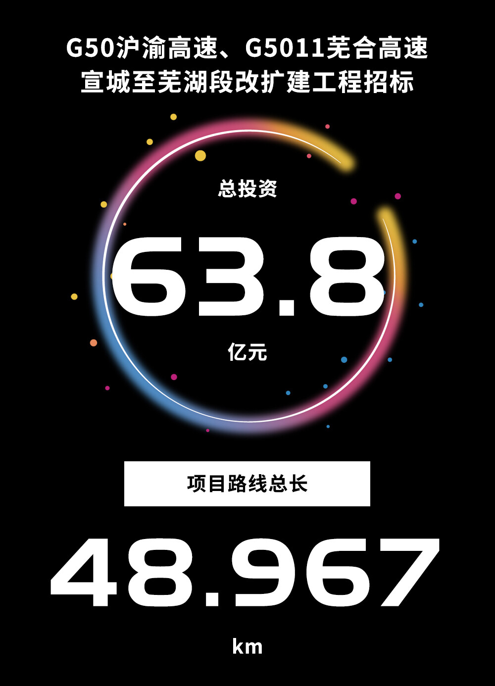 2022年9月15日,安徽合肥公共资源交易中心发布了G50沪渝高速、G5011芜合高速宣城至芜湖段改扩建土建工程施工招标公告,该项目所属行业公路,招标人安徽省交控建设管理有限公司,项目总投资63.8亿元。