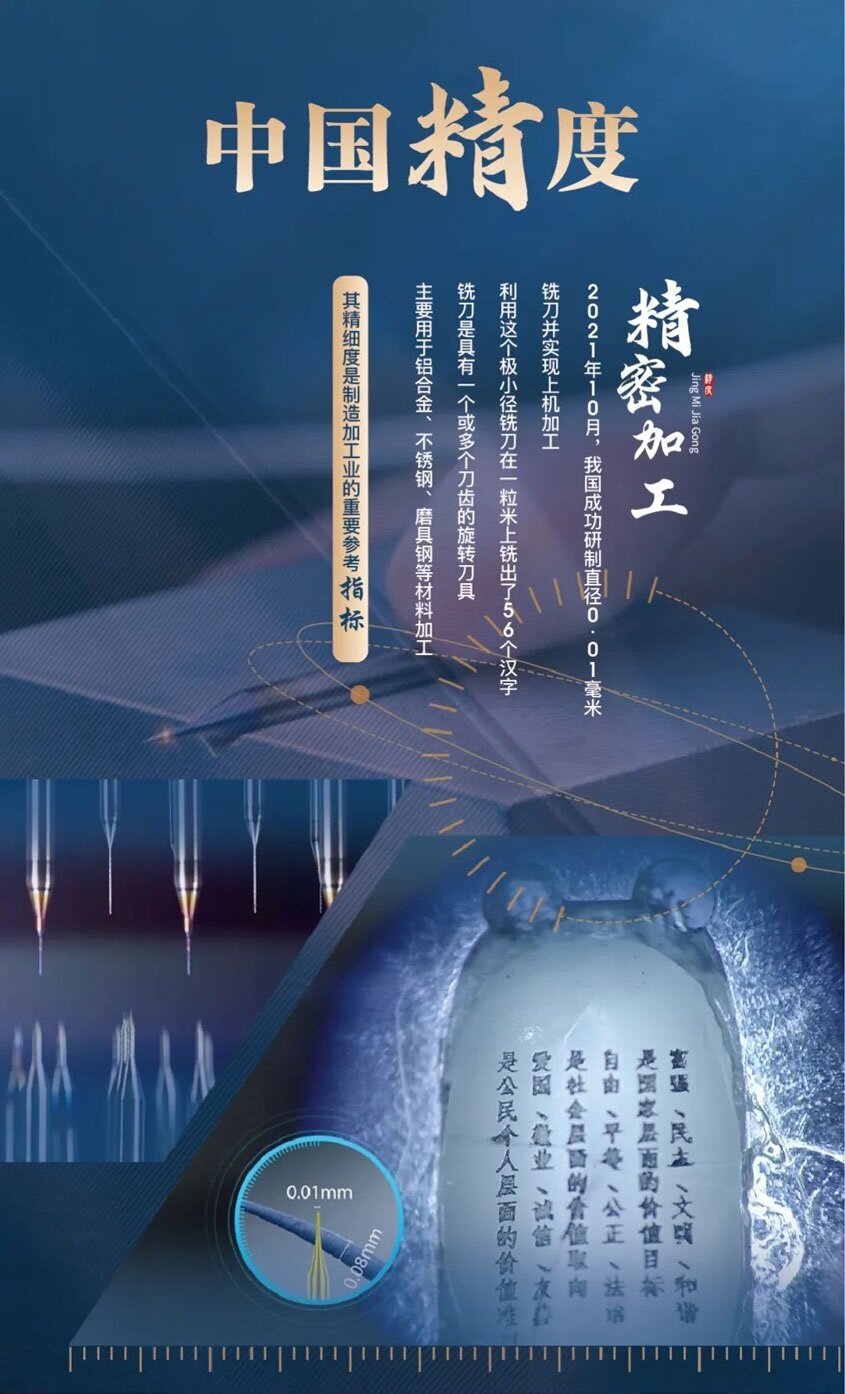 世界上用于工业生产的最小的硬质合金铣刀,它的直径只有0.01毫米,仅相当于头发丝的八分之一。作为“最精致的工业牙齿”,这支极小径铣刀一举解决了相关行业生产中的卡脖子问题,助力中国微型加工工具更快更好地突破升级。