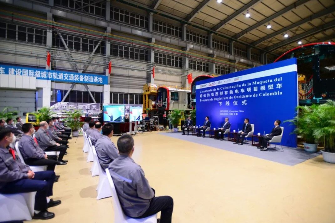 近日,哥伦比亚西部有轨电车项目模型车在中车长客股份公司正式亮相。车辆下线仪式通过视频的方式连接哥伦比亚和长春两地。哥伦比亚昆迪纳马卡省省长尼古拉斯·加西亚,中国土木工程集团有限公司董事长刘为民,哥伦比亚昆迪纳马卡省区域铁路公司总经理杰米,中车长客股份公司党委副书记、总经理刘长青等参加下线仪式。