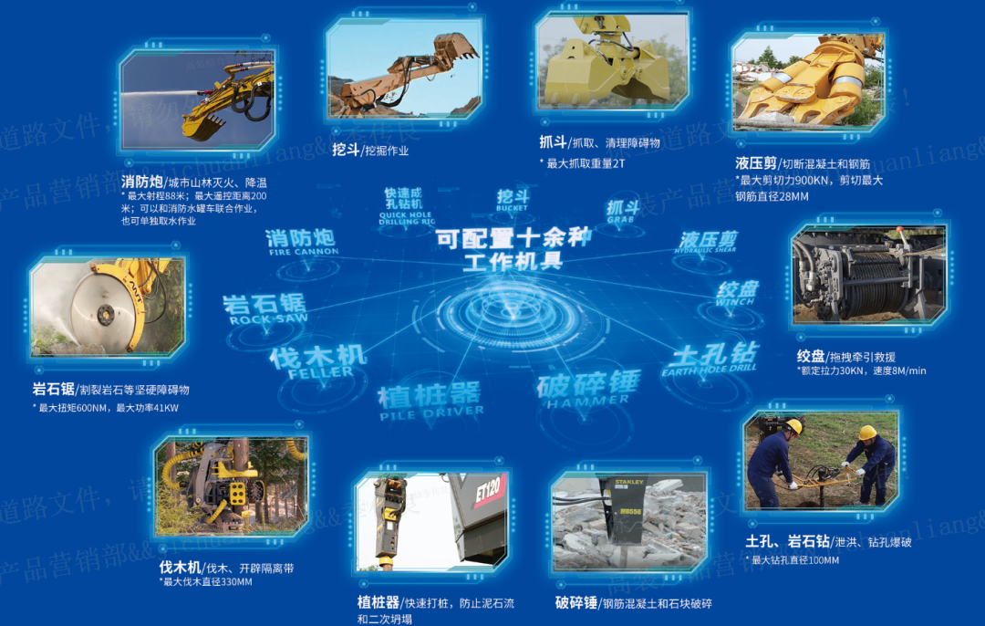 钢铁螳螂具有完备的液压动力接口,配有7路液压动力接口,可实现挖掘、灭火、伐木、切割、破碎、钻孔、剪切、打桩等十多种作业功能。