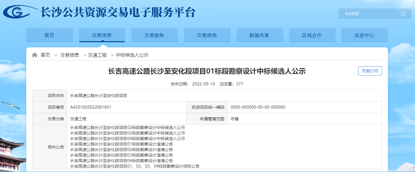 2022年9月19日,长沙公共资源交易电子服务平台发布了长吉高速公路长沙至安化段项目勘察设计中标候选人公示,项目共分为4个标段建设,项目总投资约264.2亿元。