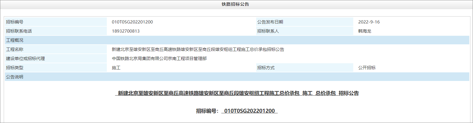 2022年9月20日,北京市建设工程信息网发布了新建北京至雄安新区至商丘高速铁路雄安新区至商丘段雄安枢纽工程施工总价承包招标公告,该项目所属行业铁路,招标人雄安高速铁路有限公司,计划工期972日历天。