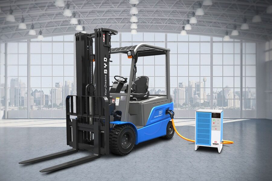 电池是电动叉车核心部件。比亚迪叉车使用的是零污染、长寿命、高安全、可大倍率充放电、免维护、适应高低温工作环境的锂电池,具有出色的运行时间和快速充电功能。