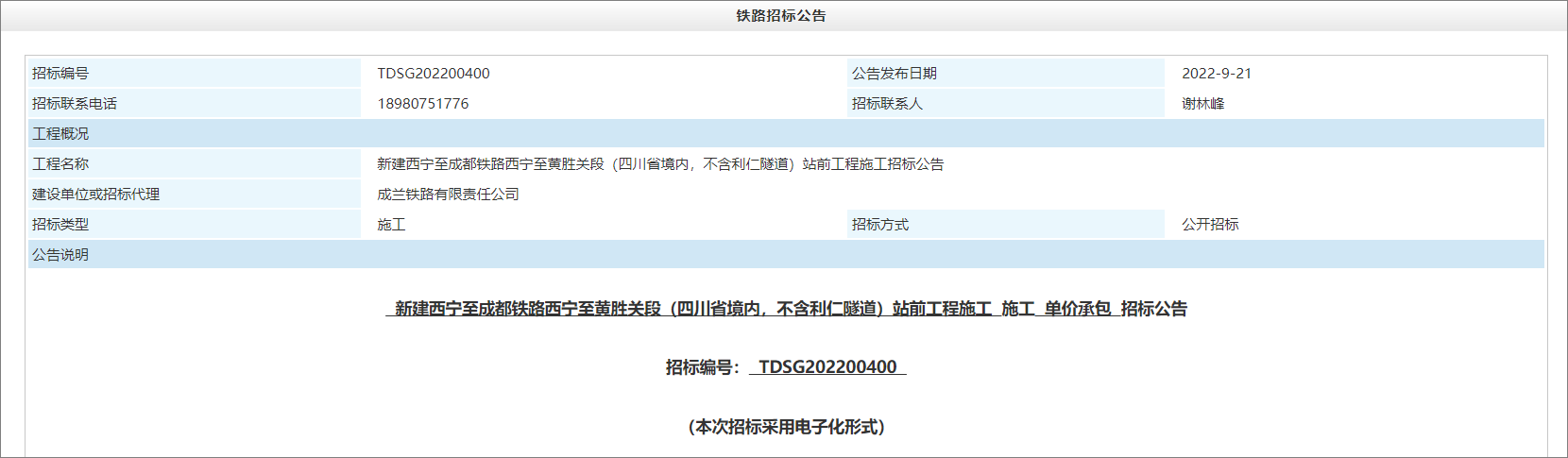 2022年9月21日,北京市建设工程信息网发布了新建西宁至成都铁路西宁至黄胜关段站前工程施工单价承包招标公告,该项目所属行业铁路,招标人成兰铁路有限责任公司,项目总投资780.7亿。