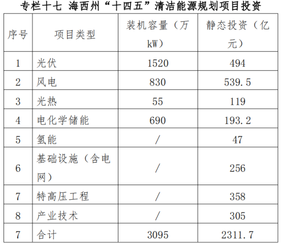 In terms of investment, Haixi Prefecture's "14th Five-Year Plan" recommended an increase of 15.2 million kilowatts in photovoltaics, with an investment demand of about 49.4 billion yuan; wind power increased by 8.3 million kilowatts, with an investment demand of about 53.955 billion yuan, and solar thermal 550,000 kilowatts , the investment demand is about 11.9 billion yuan; the new energy power generation supporting electrochemical energy storage investment is about 19.32 billion yuan; the infrastructure investment is about 25.6 billion yuan; the UHV transmission channel project investment is about 35.8 billion yuan; clean energy supporting industries and technology research investment About 30.5 billion yuan.
