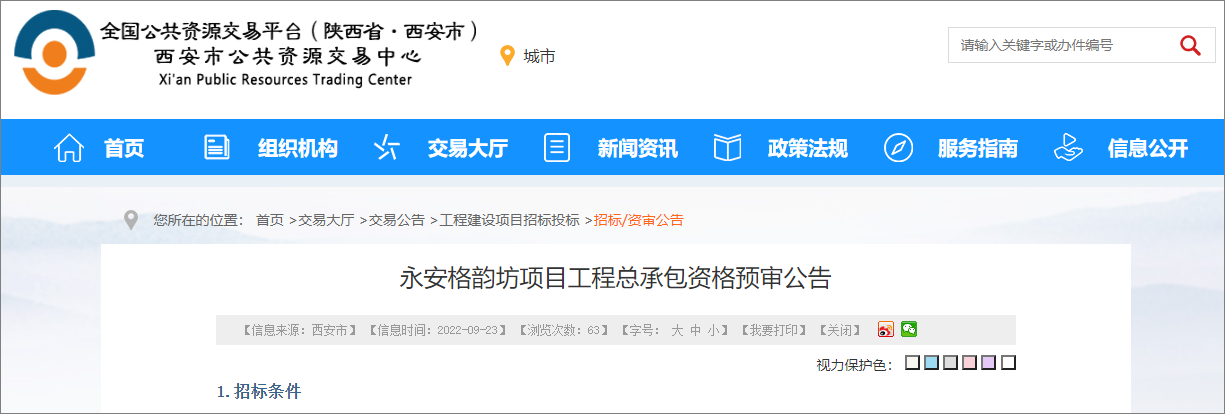2022年9月23日,陕西省公共资源交易中心发布了西安永安格韵坊项目工程总承包资格预审公告,该项目所属行业房建,招标人西安市高新区创樾城市发展建设有限公司,项目总投资约35.87亿元。