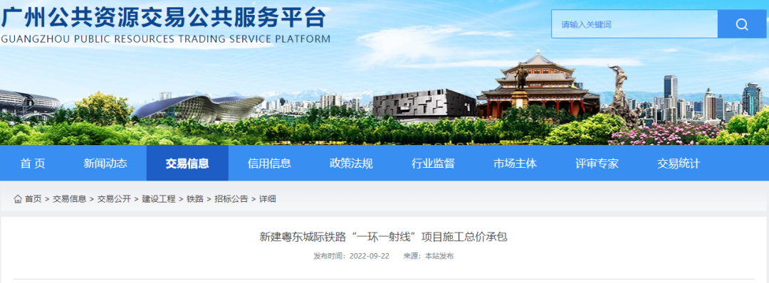 2022年9月22日,《新建粤东城际铁路一环一射线项目施工总价承包》招标公告在广州公共资源交易公共服务平台发布。项目全线即将进入正式施工阶段,计划工期4.5年。