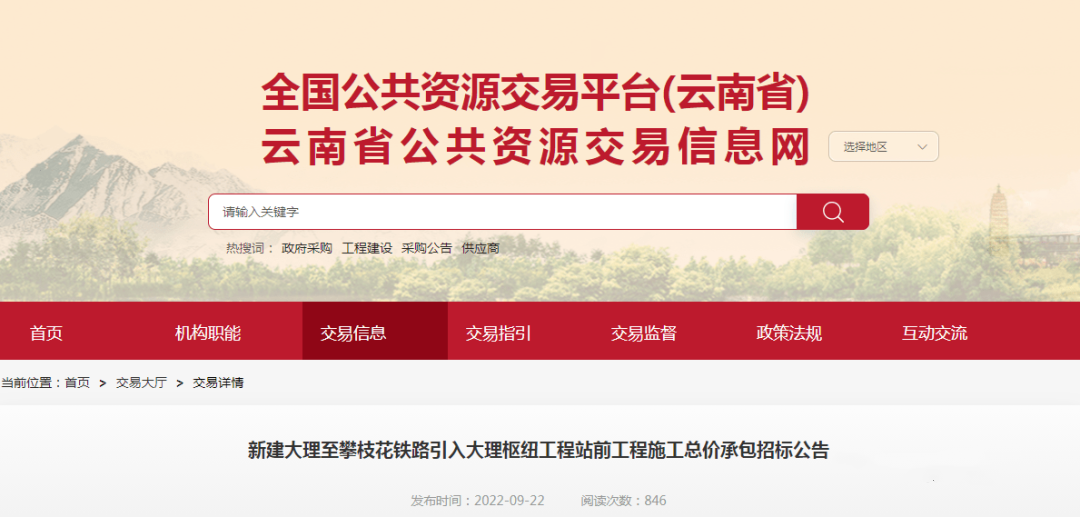 2022年9月22日,云南省公共资源交易信息网发布《新建大理至攀枝花铁路引入大理枢纽工程站前工程施工总价承包招标公告》。根据招标公告,项目2022年10月底开工,工期3年。